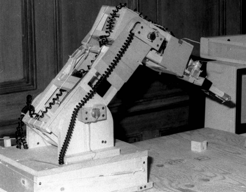 Photograph of Phase I Arm at Worcester Regional Science Fair, held at Worcester Polytechnic Institute. Phase I was, in several ways, a surprise to many people. It was surprising that the initial version was completed in less than a month, and it was even more surprising that it worked. Many thought the idea of attempting to create a computer-controlled robot arm from scratch was crazy for a 14 year old high school freshman. However, encouragement from my advisors, parents and friends, perseverence, and a little bit of luck led to success. This success and the potential for improvements in the design were primary motivators for the work that would follow.